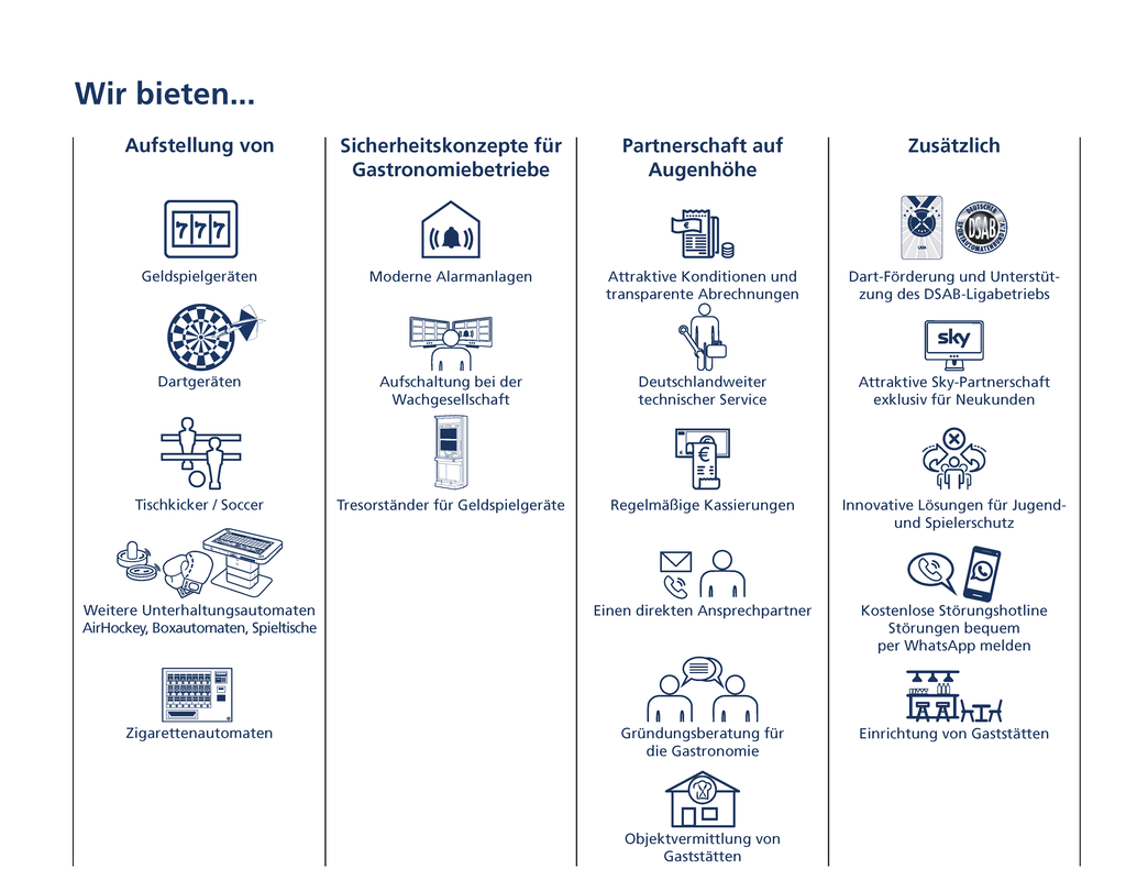 Anspruchsvolle Gäste suchen abwechslungsreiche Unterhaltung. Mit ADMIRAL bekommen Sie ein attraktives und modernes Unterhaltungsangebot für Ihre Gäste. Wir planen und implementieren ein stimmiges Gesamtkonzept mit innovativen Geldspiel- und Unterhaltungsgeräten, das genau zu Ihrem Geschäft passt. Jährlich stellen wir die neuesten Spiel-Pakete zur Verfügung, sodass Sie einen optimalen Gerätemix und dadurch zufriedene Gäste haben. Neben Geldspielgeräten gehören E-Dartgeräte und Home-Soccer zu unserem Unterhaltungsangebot. Mit uns haben Sie einen Partner an Ihrer Seite, der Ihre Bedürfnisse und die Zukunft im Blick hat.