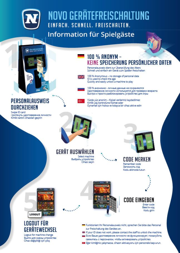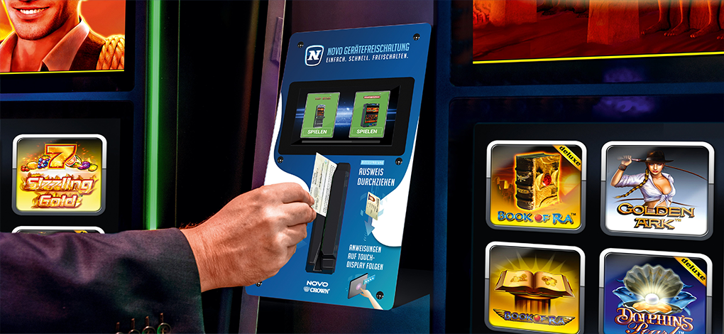 Geldspielgeräte müssen zum Spielen freigeschaltet werden. Damit Ihr Servicepersonal entlastet wird, bieten wir Ihnen das myNOVO-Terminal Gastro. So können Spielgäste am Terminal eigenständig das Geldspielgerät freischalten – einfach über den Ausweis, den Reisepass und alle Dokumente mit einer maschinenlesbaren Zone. Der Ausweisleser liest nach ICAO-Standard aus und erkennt über 490 Millionen Dokumente. Sichere Prüfung, mehr Flexibilität. Zudem nutzen Sie mit dem Freischaltterminal die Vorteile der Vernetzung. Alles im Blick mit einer Lösung.